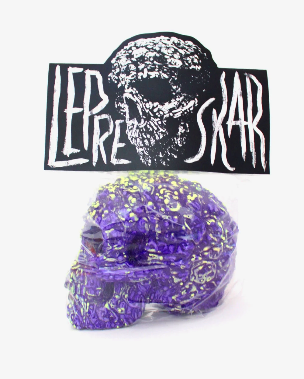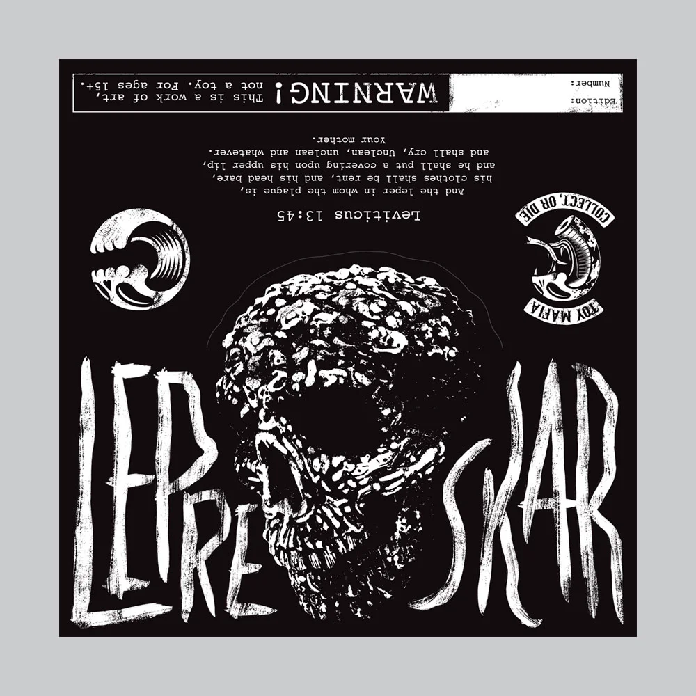 "Born in hellfire and left to rot in a field of disease, The "Lepreskar" is the perfect addition to any maggot infested collection of plastic joy! Mottled with patches of oozing flesh, the Toy Mafia name appears twisted into the back of the head!"