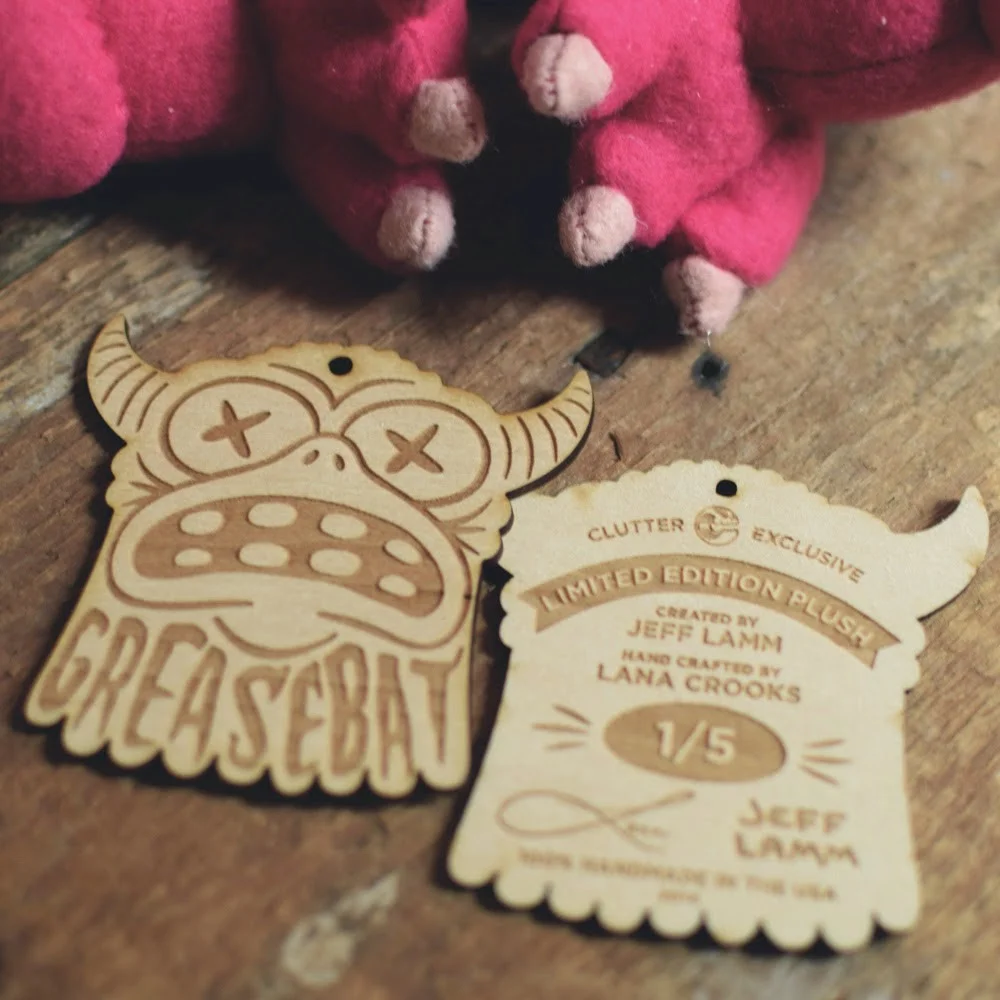 Laser etched wooden tag to accompany the super-limited plush 'Greasebat' produced by award winning artist Lana Crooks.